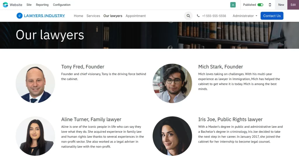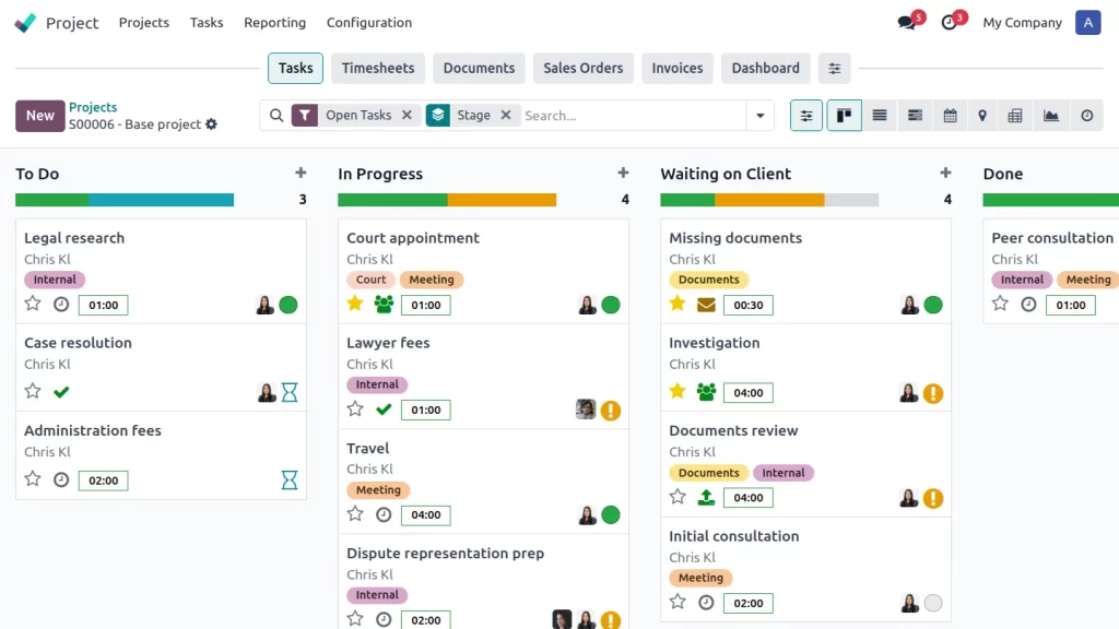 Odoo vous permet de créer un site web dédié, de prendre des rendez-vous, de gérer vos dossiers, ainsi que de stocker et signer des documents en toute sécurité. Associé à des feuilles de temps et une facturation performantes, c’est la solution idéale pour votre cabinet d’avocats.