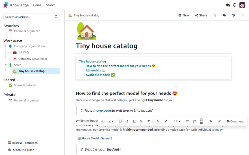 Odoo Knowledge vous permet de centraliser toutes les informations importantes de votre organisation, de travailler dessus en équipe et d’y accéder depuis n’importe quelle application Odoo.