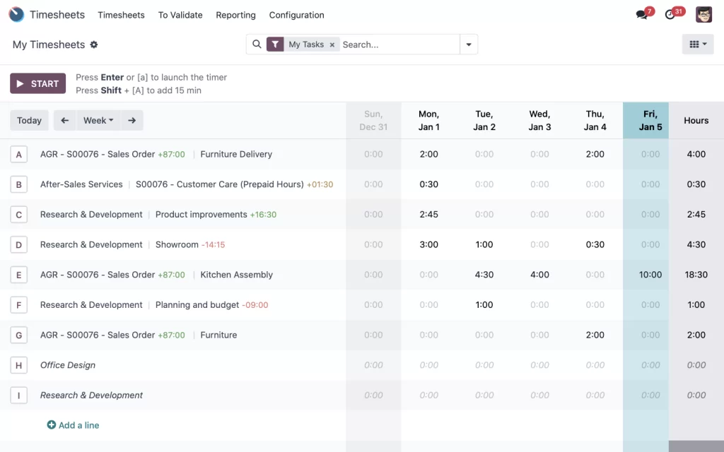 Odoo Timesheets permet à votre équipe de suivre et de valider les heures facturables, d’approuver le temps passé sur les tâches et de simplifier la facturation de vos services. Le tout dans une interface unique et intuitive.