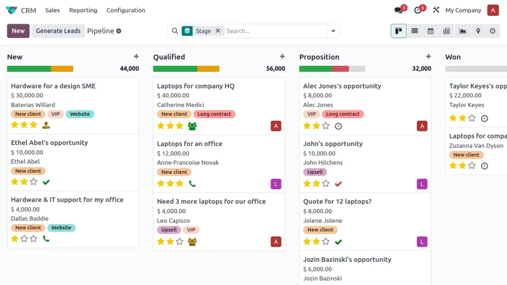 Les détails de chaque prospect, y compris les activités prévues, les coordonnées et le chiffre d’affaires estimé, sont centralisés dans un pipeline CRM par glisser-déposer.