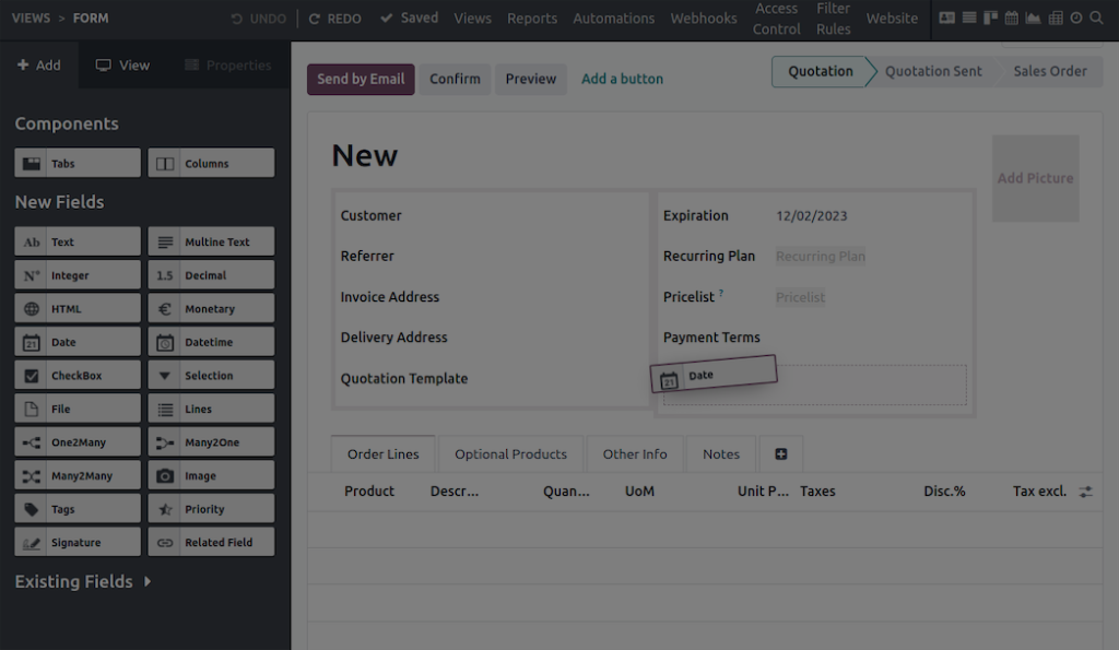 Avec Odoo Studio, vous avez le contrôle, aucune connaissance en programmation n’est requise. Ajoutez des champs, créez de nouvelles vues et optimisez vos flux de travail, le tout en toute simplicité. N’importe quelle limite !
